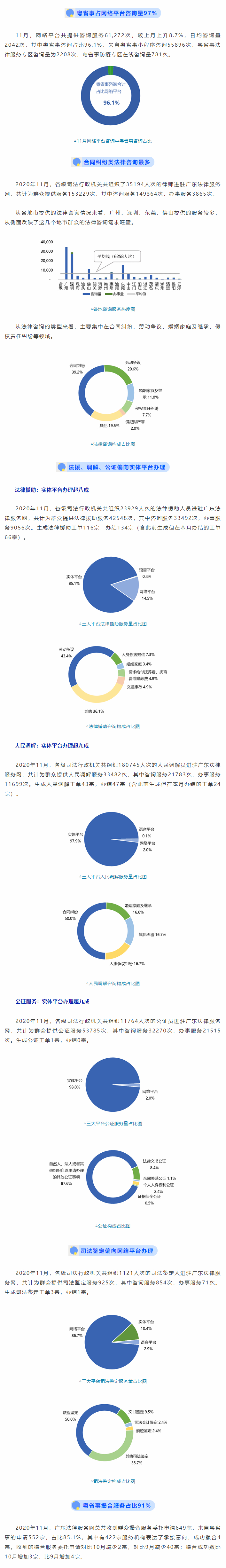 2020年11月,广东法律服务网语音、网络、实体三大平台共计为群众提供了法律咨询、办事等服务约64.59万次,较上月上升17.9%。