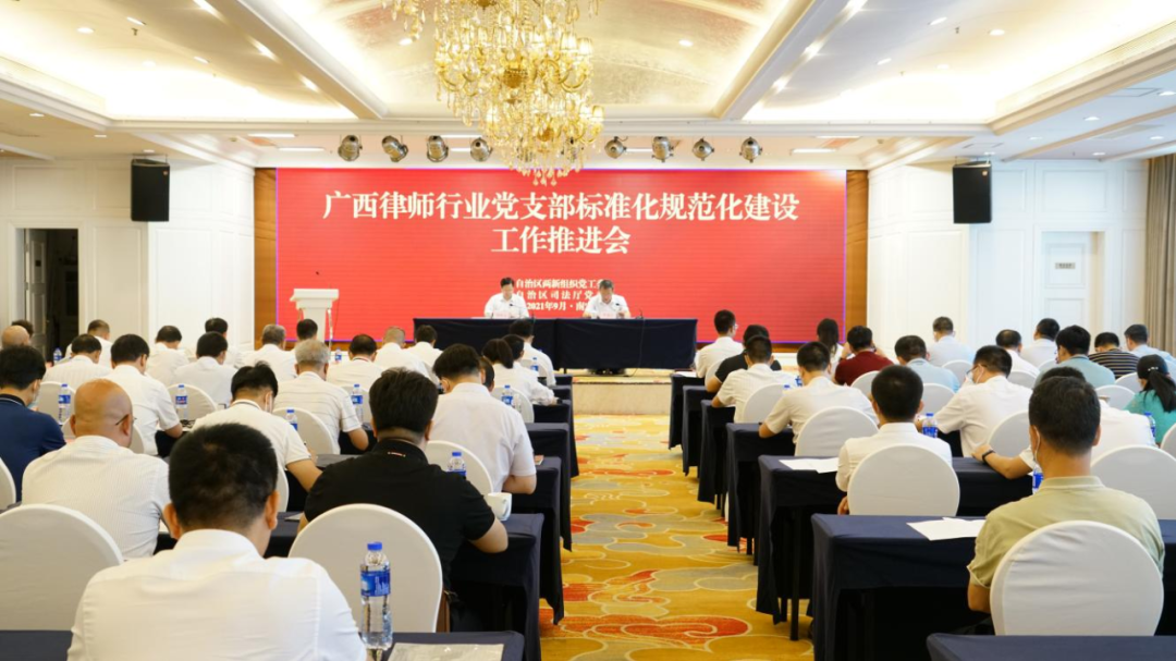 2021年9月8日上午,自治区两新组织党工委、自治区司法厅党委在南宁联合召开广西律师行业党支部标准化规范化建设工作推进会,深入学习贯彻习近平新时代中国特色社会主义思想和习近平总书记“七一”重要讲话精神,贯彻落实全国、全区组织部长会议和全国律师行业党建工作经验交流会精神,总结交流近年来全区律师行业党的建设工作经验,研究部署深入推进党支部标准化规范化建设。自治区党委组织部一级巡视员刘水玉出席会议并讲话,自治区司法厅党委委员、副厅长、广西律师行业党委书记李道宁主持会议并讲话。