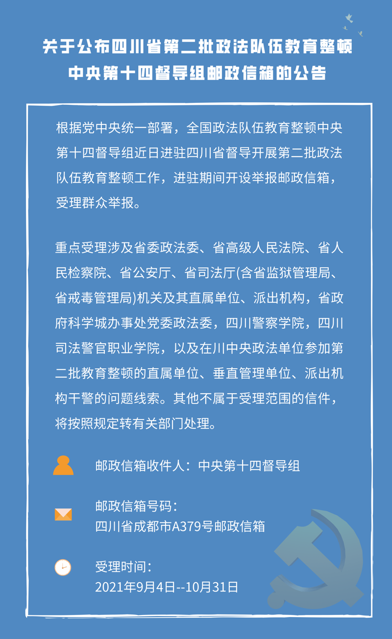 关于公布四川省第二批政法队伍教育整顿中央第十四督导组邮政信箱的公告