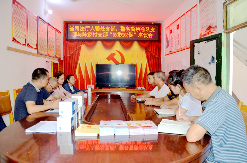 在陈家村,厅警务督察总队党支部、人事警务处党支部先与陈家村党支部召开座谈会,围绕“双联双促”工作开展情况、村支两委建设情况,存在哪些困难、问题和不足,下一步如何推进“双联双促”工作取得实效等进行热烈沟通和交流。座谈中还围绕了开展政策宣传、强化村党组织建设、发展乡村产业、提升基层治理水平、建设文明乡村等展开深入交流,就今后日常工作联动机制达成一致意见。厅警务督察总队党支部、人事警务处党支部都表示将充分发挥省直机关优势,打通政策落地“最后一公里”,强化“实地+线上”工作方式,做到驻村干部、责任党员、责任党支部三方信息互通,及时掌握联户对象实际情况,切实推动各项工作任务落地见效。警务督察总队党支部、人事警务处党支部还向陈家村党支部赠送了防疫口罩、普法宣传册、法律读本等物资。