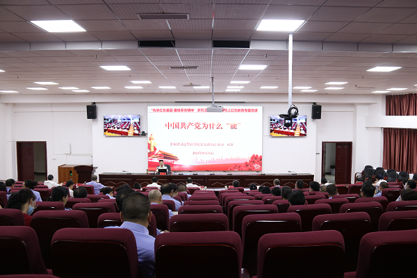 根据学校队伍教育整顿学习教育环节工作方案的安排,开展“传承红色基因 赓续革命精神”系列活动之主要领导上红色教育专题党课。8月31日晚,学校邀请校党委副书记、政委何徕同志给全校民警职工上了一堂题为《中国共产党为什么“能”》的党课。