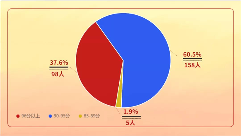 从测试成绩来看,96分以上98人,占比37.6%;90-95分158人,占比60.5%;85-89分5人,占比1.9%。广大警察职工对应知应会知识的掌握比较全面、准确,能够结合工作实际,充分认识到政法队伍教育整顿的重要意义。通过这次知识测试,全面检验了第二批政法队伍教育整顿学习成果,集中展示了局机关全体警察职工积极的学习态度和良好的知识素养,达到了以考促学、学用结合、知行合一的学习目的,为查纠整改和总结提升环节的开展奠定了坚实的思想基础和理论基础,确保全省监狱系统第二批政法队伍教育整顿高质量推进。
