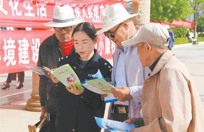 海东市禁毒办、公安局民警为过往群众解读、宣讲识毒防毒知识。省人大常委会法工委供图