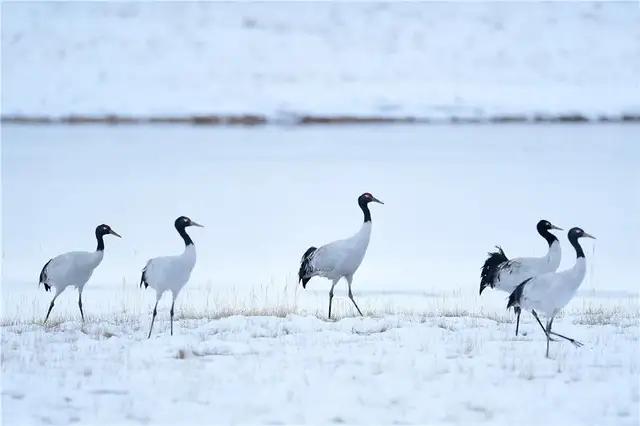 2021年10月21日在位于青海省的三江源国家公园黄河源园区内拍摄的黑颈鹤。新华社记者 张龙 摄