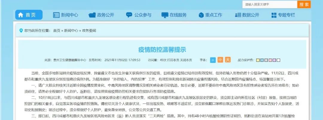 当前,全国多地新冠肺炎疫情出现反弹,我省遵义市也发生外省关联病例引发的疫情,目前遵义疫情已经得到有效控制,但外防输入形势仍然十分复杂严峻。11月2日,四川成都市和重庆九龙坡区分别发现确诊病例1例。为精准做好“外防输入、内防反弹”工作,有效控制和降低新冠肺炎疫情传播风险,结合近期国内疫情特点,特温馨提示如下。