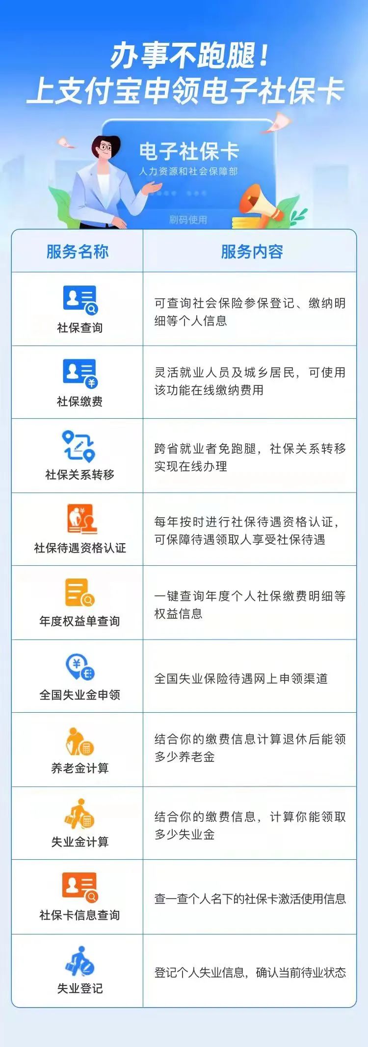 申领电子社保卡,市民只需在支付宝首页搜索“电子社保卡”,即可进入电子社保卡页面,按操作提示领取电子社保卡。领取成功后,市民使用电子社保卡可在线进行养老待遇领取认证、工伤待遇认证和全国失业金领取等业务办理。