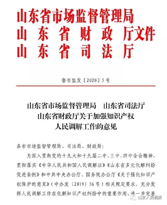 为充分发挥人民调解工作在化解知识产权纠纷中的重要作用,进一步完善知识产权纠纷多元化解机制,建立健全知识产权社会共治模式,构建知识产权大保护工作格局,近日,省司法厅与省市场监管局、省财政厅联合出台《关于加强知识产权人民调解工作的意见》。