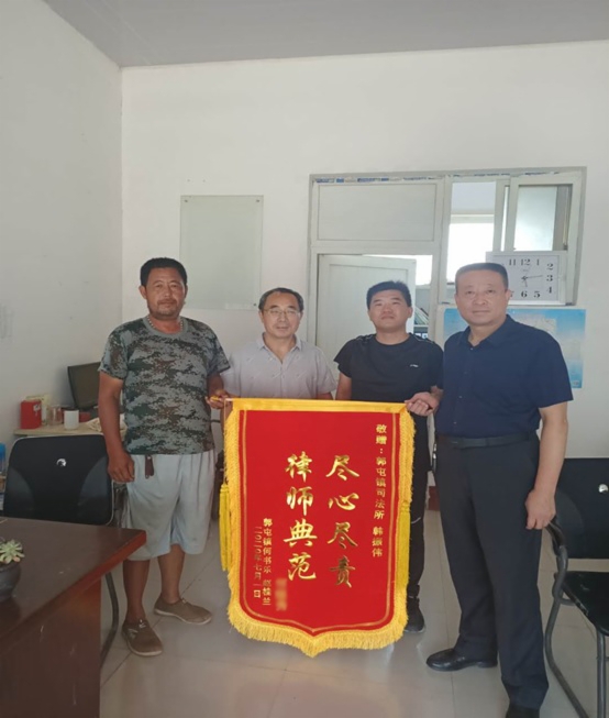 何某非常感激阳谷县法律援助中心和郭屯镇司法所对自己的帮助,为表感谢,特意制作了锦旗送到郭屯司法所,并合影留念。