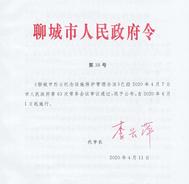 《聊城市烈士纪念设施保护管理办法》经2020年4月7日聊城市人民政府第63次常务会议审议通过,将于2020年6月1日起施行。