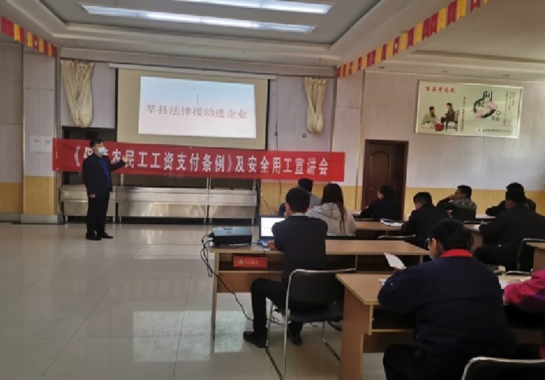 在“五一国际劳动节”到来之际,为全面保障农民工合法权益,推动形成和谐的劳资关系,4月28日,莘县法律援助中心走进山东莘县森源实业有限公司,集中开展了《保障农民工工资支付条例》及安全用工宣讲会。