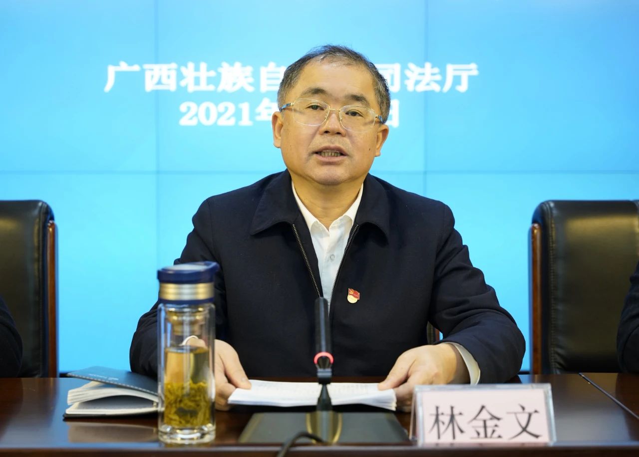 林金文强调,全区司法行政系统要深入学习贯彻习近平新时代中国特色社会主义思想、习近平法治思想、习近平总书记关于加强政法队伍建设重要指示精神和训词精神,认真贯彻落实全国政法队伍教育整顿动员部署会、全国司法行政系统队伍教育整顿动员部署会和全区政法队伍教育整顿动员部署会精神,进一步树牢“四个意识”,坚定“四个自信”,做到“两个维护”,推动教育整顿高站位筹划、高标准落实,以优异的成绩向建党100周年献礼。