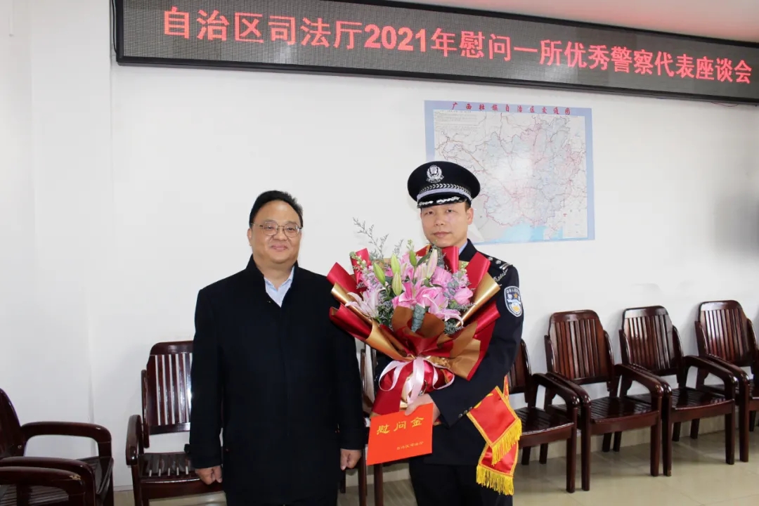 1月15日下午,自治区司法厅厅长雷震率队先后来到广西第一强制隔离戒毒所和广西未成年犯管教所(邕州监狱)看望慰问优秀警察代表潘达雄和困难党员警察李军,并通过他们向全区司法行政系统干警致以美好的祝福和诚挚的慰问。