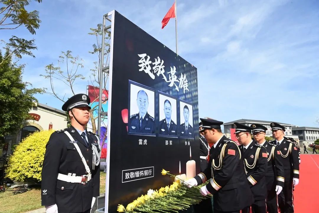 仪式最后,现场民(辅)警及因公牺牲民警家属向因公(工)牺牲民(辅)警遗像敬献鲜花,表达深切缅怀和崇高敬意。