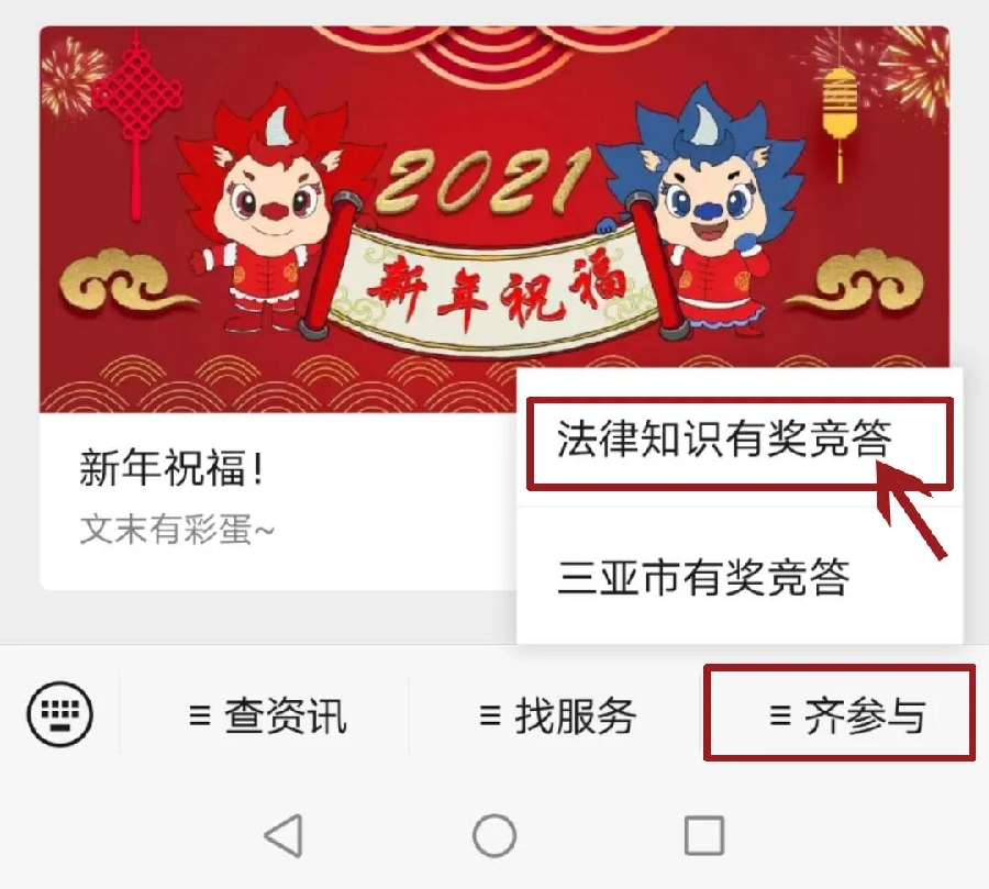 答题方法:关注中国普法微信公众号,在手机下方子菜单“齐参与”中找到“法律知识有奖竞答”进入答题页面即可答题。