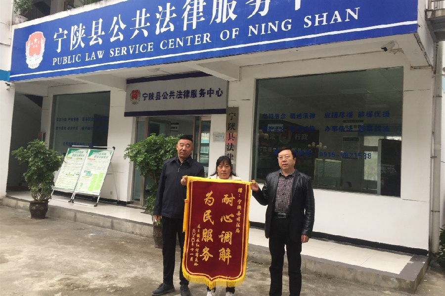 11月5日,安康市宁陕县司法局收到了龙王镇永红村村民蒋友玲赠送的“耐心调解 为民服务”的锦旗,这是宁陕县矛盾纠纷调解中心成立以来,历时6天,调解成功的第1件重大纠纷。