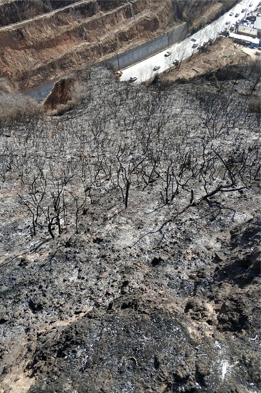 转过一个山坡,大家发现火情比想象的更加严重!天干物燥加上强风,山火快速蔓延,已经蔓延到一处山梁上,火势窜起几米高,很远都能听见松树燃烧的爆裂声!上方不远处有高压线,下发就是隧道和马路,车流量很大,山脚下更有居民房屋!情况紧急!