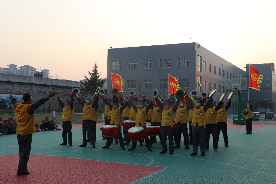 击行鼓。岁岁闹元宵,震天锣鼓敲。看,鼓手们头戴红缨凉帽,身披黄马褂,腰束白色布裙,个个笑容满面,熟练地敲打着黄河行鼓,时而鼓点紧凑,时而放慢节奏,队形变换让人眼花缭乱,通过这种接地气又有特色的活动,活跃了场所节日氛围,展示了戒毒人员良好的精神面貌。