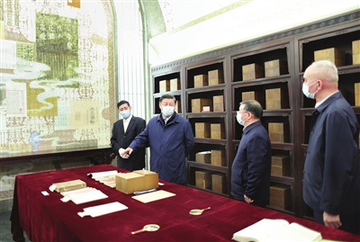 6月2日,中共中央总书记、国家主席、中央军委主席习近平在北京出席文化传承发展座谈会并发表重要讲话。这是座谈会前,习近平1日下午在中国国家版本馆考察时,在兰台洞库了解馆藏精品版本保存情况。