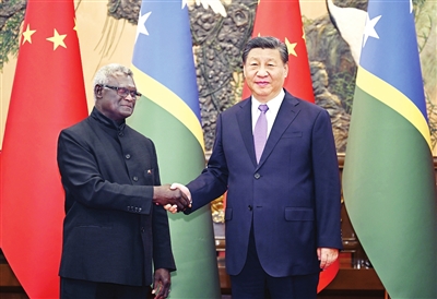 习近平指出,中国和所罗门群岛是彼此值得信赖的好朋友、可以依靠的好兄弟。建交以来,两国友好合作后来居上,走在了中国同太平洋岛国关系前列,成为不同大小国家和发展中国家团结合作、携手发展的典范。事实证明,中所建交顺应时代潮流,契合国际大势,符合两国人民根本利益,是正确选择。中方愿同所方加强战略沟通,深化各领域合作,推动两国全面战略伙伴关系行稳致远、好上加好,更好造福两国人民。
