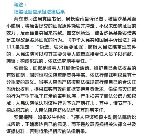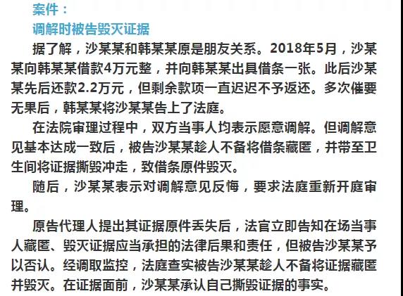 今年1月28日,西宁市城东区人民法院十里铺法庭调解了一起借款纠纷案。在双方意见达成一致时,被告沙某某竟偷偷将借条带至厕所撕毁冲走。沙某某撕毁证据的行为该承担什么样的责任?