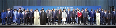 当地时间8月24日上午,国家主席习近平在约翰内斯堡出席金砖国家同非洲国家及其他新兴市场和发展中国家领导人对话会。 会议由南非总统拉马福萨主持,巴西总统卢拉、印度总理莫迪、俄罗斯总统普京(线上)和60多位非洲国家及其他新兴市场和发展中国家领导人或代表,以及联合国秘书长古特雷斯、新开发银行行长罗塞夫等国际和地区组织负责人出席。这是与会领导人集体合影。