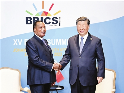 当地时间8月24日上午,国家主席习近平在约翰内斯堡出席金砖国家领导人会晤期间会见刚果(布)总统萨苏。
