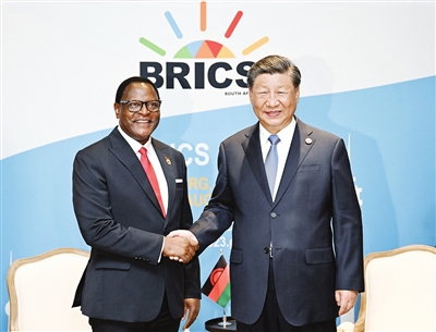 当地时间8月24日上午,国家主席习近平在约翰内斯堡出席金砖国家领导人会晤期间会见马拉维总统查克维拉。