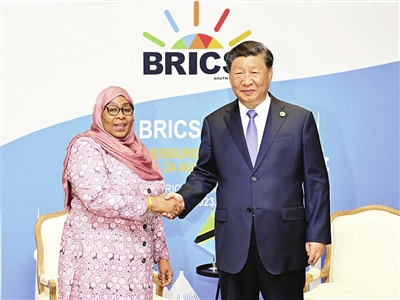 当地时间8月24日上午,国家主席习近平在约翰内斯堡出席金砖国家领导人会晤期间会见坦桑尼亚总统哈桑。