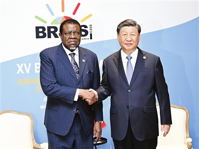 当地时间8月24日上午,国家主席习近平在约翰内斯堡出席金砖国家领导人会晤期间会见纳米比亚总统根哥布。