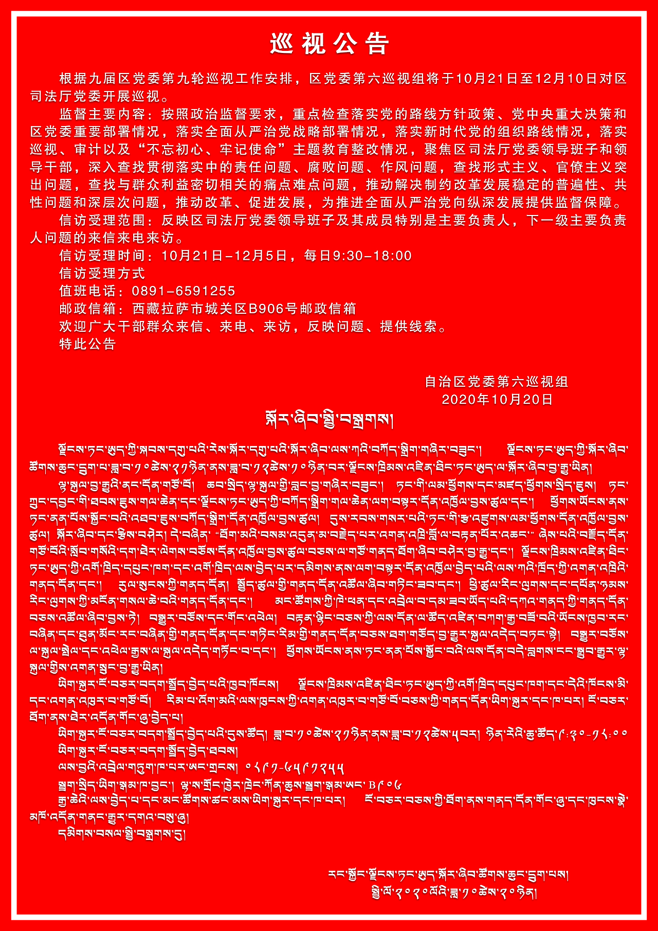 监督主要内容:按照政治监督要求,重点检查落实党的路线方针政策、党中央重大决策和区党委重要部署情况,落实全面从严治党战略部署情况,落实新时代党的组织路线情况,落实巡视、审计以及“不忘初心、牢记使命”主题教育整改情况,聚焦区司法厅党委领导班子和领导干部,深入查找贯彻落实中的责任问题、腐败问题、作风问题,查找形式主义、官僚主义突出问题,查找与群众利益密切相关的痛点难点问题,推动解决制约改革发展稳定的普遍性、共性问题和深层次问题,推动改革、促进发展,为推进全面从严治党向纵深发展提供监督保障。信访受理范围:反映区司法厅党委领导班子及其成员特别是主要负责人,下一级主要负责人问题的来信来电来访。信访受理时间:10月21日-12月5日,每日9:30-18:00信访受理方式:值班电话:0891-6591255邮政信箱:西藏拉萨市城关区B906号邮政信箱欢迎广大干部群众来信、来电、来访,反映问题、提供线索。特此公告自治区党委第六巡视组2020年10月20日