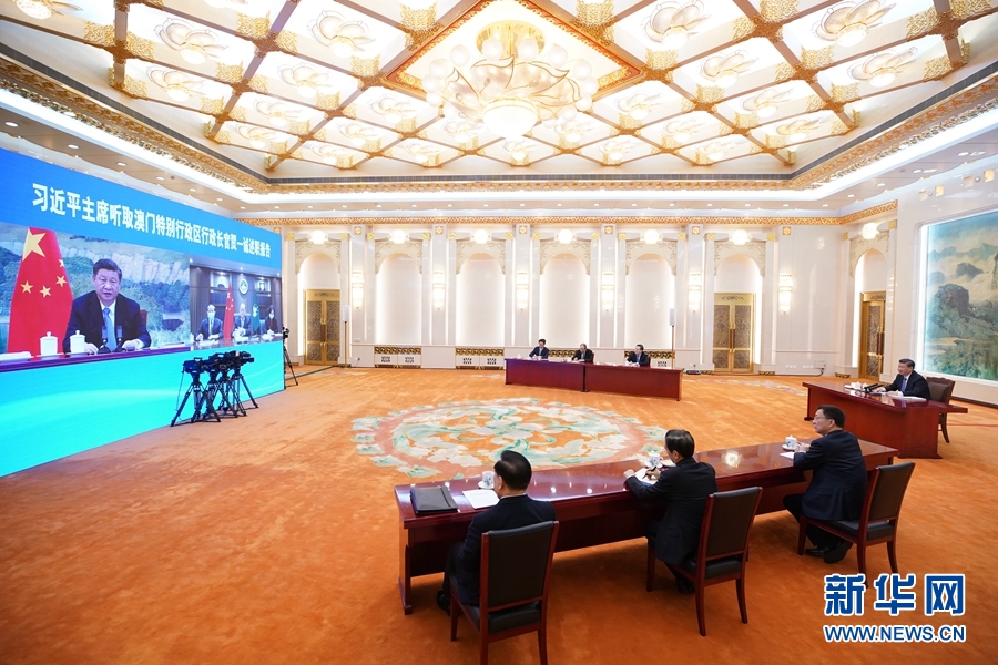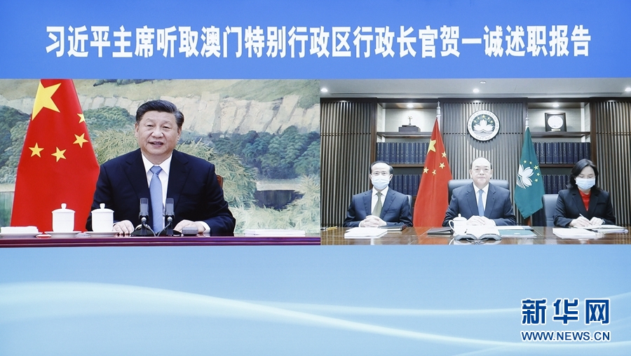 1月27日,国家主席习近平在北京以视频连线方式听取了澳门特别行政区行政长官贺一诚2020年度的述职报告。新华社记者 鞠鹏 摄