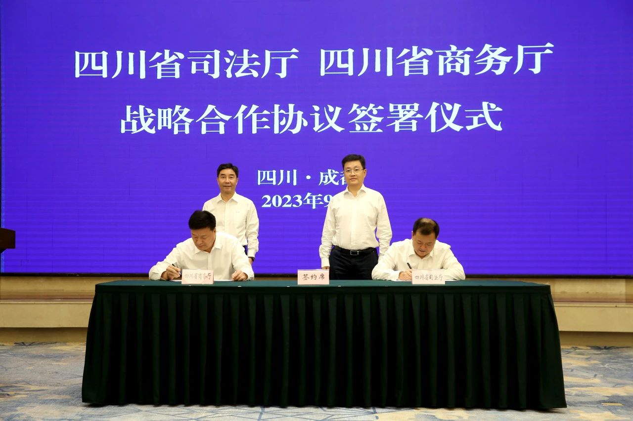 9月11日,司法厅与商务厅战略合作协议签署仪式在成都举行,共同发展涉外法律服务业,以高水平法律服务保障四川外经贸高质量发展。司法厅党委书记、厅长刘志诚,商务厅党组书记、厅长徐一心出席并致辞,司法厅党委委员、副厅长王强主持签署仪式,司法厅党委委员、机关党委书记潘奇峰,商务厅副厅长梁勇代表双方签署协议。