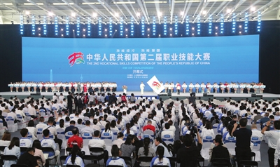 中华人民共和国第二届职业技能大赛昨日在国家会展中心(天津)开幕。图为大赛开幕式会场。