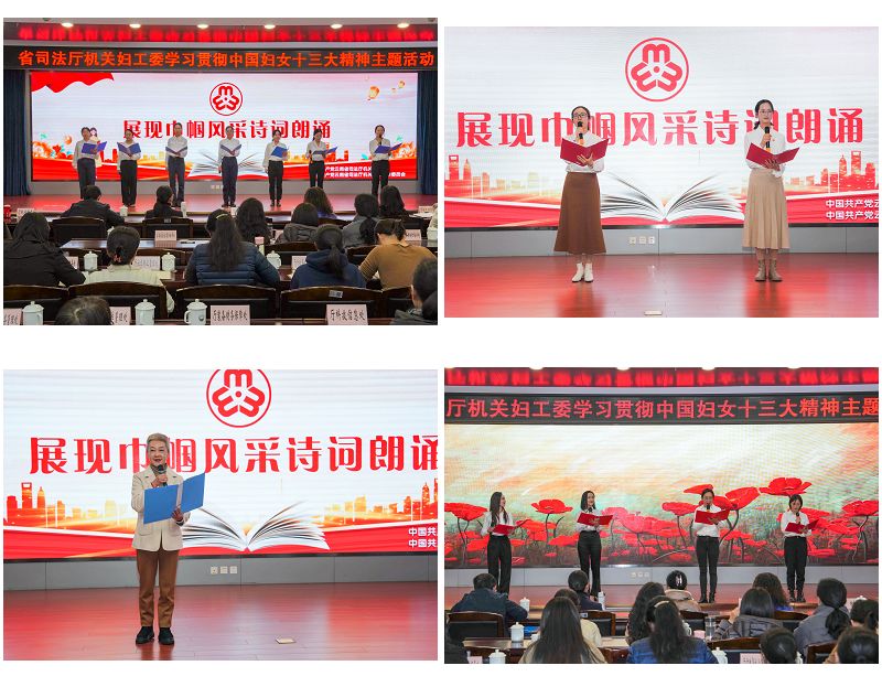主题活动首先组织全体人员对习近平总书记关于妇女工作有关重要讲话精神、中国妇女十三大会议精神、习近平同全国妇联新一届领导班子成员集体谈话精神进行专题学习。在“展现巾帼风采”诗词朗诵中,厅机关年轻妇女干部带来《妇女之歌--春天里的花仙子》《家风颂》、退休妇女代表带来《变老的时候》、省政法干部学校妇女代表带来《巾帼颂》等配乐诗朗诵,以诗歌为载体,把传统美德、文明风尚融入家庭生活和工作实践中,抒发了省司法厅妇女干部强烈的历史自觉,展现了省司法厅妇女干部昂扬的精神面貌,在新征程上谱写“半边天”更加绚丽的华章。