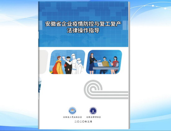 编制《安徽省企业疫情防控与复工复产法律操作指导》,及时汇总中央和我省涉及企业疫情防控和复工复产的法律法规及政策规定,促进企业依法合规、安全有序复工复产,最大限度消除疫情带来的不利影响。