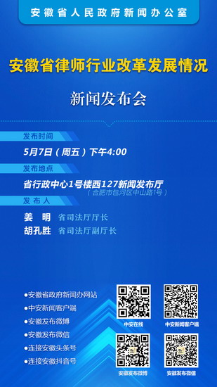 【安徽省委宣传部新闻发布处处长武潇】各位新闻界的朋友,下午好!欢迎大家出席今天的新闻发布会。今天下午,我们邀请省司法厅厅长姜明先生、副厅长胡孔胜先生到会,介绍我省扎实推进律师党建工作、持续深化律师制度改革和不断加强律师队伍建设等有关情况,并与大家互动交流,回答大家提出的问题。