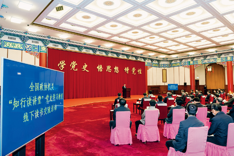 全国政协机关注重把开展党史学习教育与政协读书活动有机融合,依托委员移动履职平台网上“全国政协书院”开展读书交流活动,建立了“中共党史学习”等12个主题读书群,形成了线上线下相结合、读书履职相促进的读书学史格局,推动党史学习教育走深走实、入脑入心。图为2021年4月20日,全国政协机关在北京举办以“学党史、悟思想、增党性”为主题的党史学习教育线下读书交流活动。全国政协办公厅新闻局 王达/摄