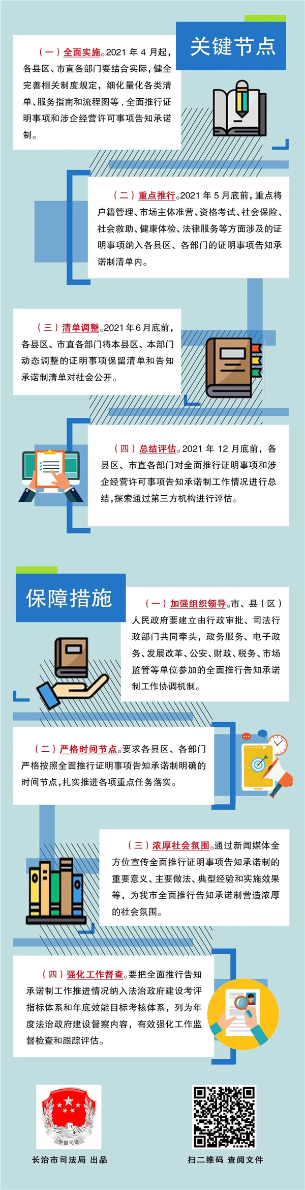 《方案》明确在全市各级行政机关办理行政许可、行政确认、行政给付等依申请的行政事项要求提供证明材料时实行证明事项告知承诺制,在行政机关办理涉企经营许可事项时实行告知承诺制。长治市司法局相关工作人员介绍,简单来说,就是企业和群众在申请办理行政事项时,行政机关一次性向申请人告知证明义务、证明内容及不实承诺的法律责任,申请人签署承诺书后,行政机关不再索要有关证明的制度。