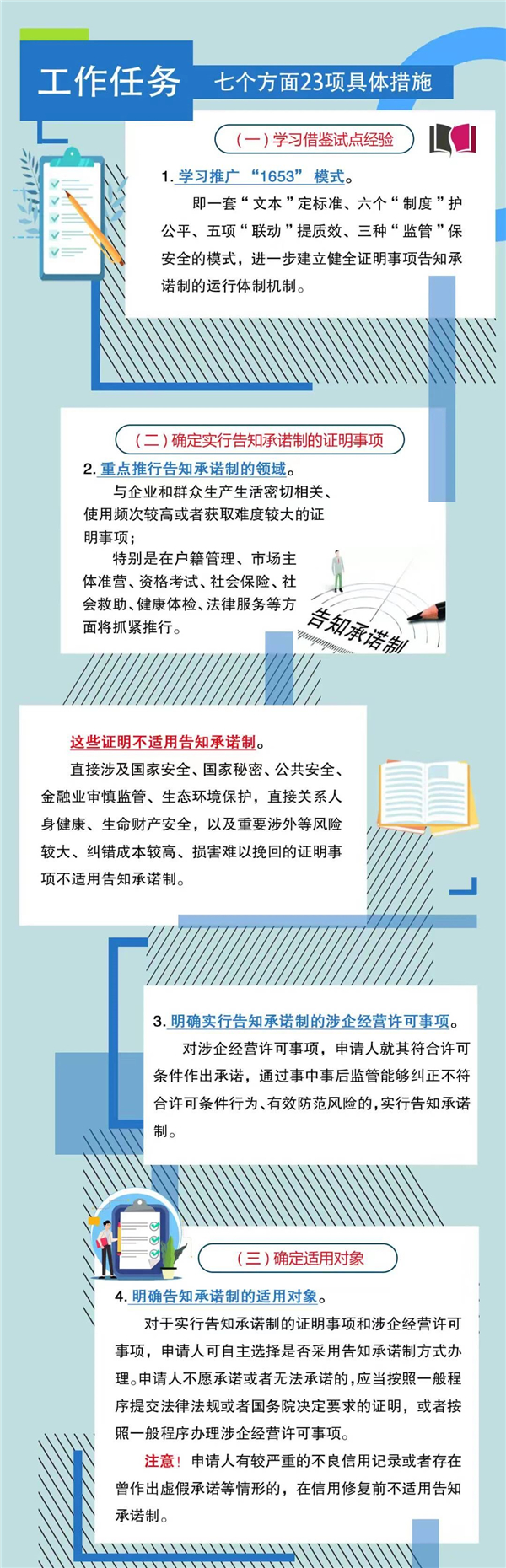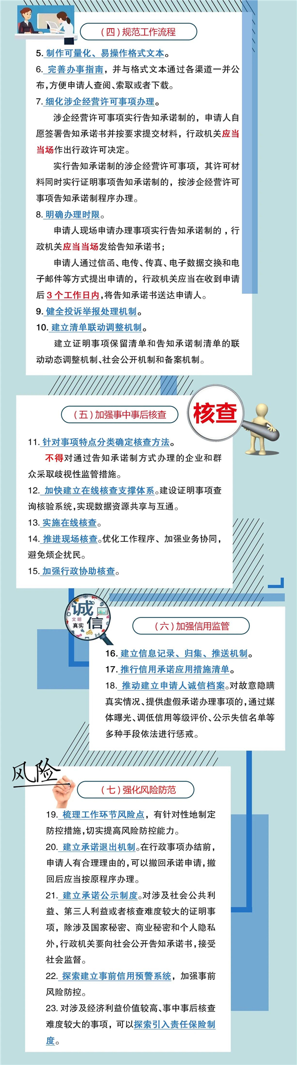 《方案》将学习借鉴试点经验、明确事项范围、确定适用对象、规范工作流程、加强事中事后核查、加强信用监管、强化风险防范等七个方面任务细化为23项具体举措;明确重点推行领域,有针对性地选取与企业和群众生产生活密切相关、使用频次较高或者获取难度较大的证明事项实行告知承诺制,特别是在户籍管理、市场主体准营、资格考试、社会保险、社会救助、健康体检、法律服务等方面抓紧推行;规范工作流程,提供8个办事文本样式的基础上,要求各部门进一步制作可量化、易操作的格式文本,完善办事指南,严格办理时限,健全投诉举报处理机制,建立证明事项保留清单和告知承诺制清单的联动动态调整机制、社会公开机制和备案机制;加强事中事后核查,针对事项特点分类确定核查方法,要求不得对通过告知承诺制方式办理的企业和群众采取歧视性监管措施,加快建立在线核查支撑体系,实施在线核查,推进现场核查,加强行政协助核查;加强信用监管,建立信息记录、归集、推送机制,推行信用承诺应用措施清单,推动建立申请人诚信档案,对故意隐瞒真实情况、提供虚假承诺办理事项的,通过媒体曝光、调低信用等级评价、公示失信名单等多种手段依法进行惩戒;强化风险防范,建立承诺退出机制和承诺公示制度,探索建立事前信用预警系统和引入责任保险制度。
