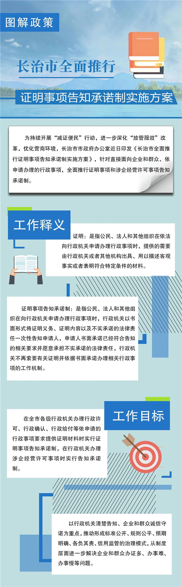 “翻箱倒柜”找证明,“东奔西跑”开证明……不少企业和群众找行政机关办事时经常遇到的这些问题,正在成为“过去式”。为进一步深化“放管服效”改革,优化营商环境,有效解决“办事难、办事慢、多头跑、来回跑”等问题,近日,长治市“减证便民”推出重大举措,长治市人民政府办公室印发《长治市全面推行证明事项告知承诺制实施方案》,全面推行证明事项告知承诺制,最大限度方便企业和群众办事创业,加快建设人民群众满意的服务型政府。