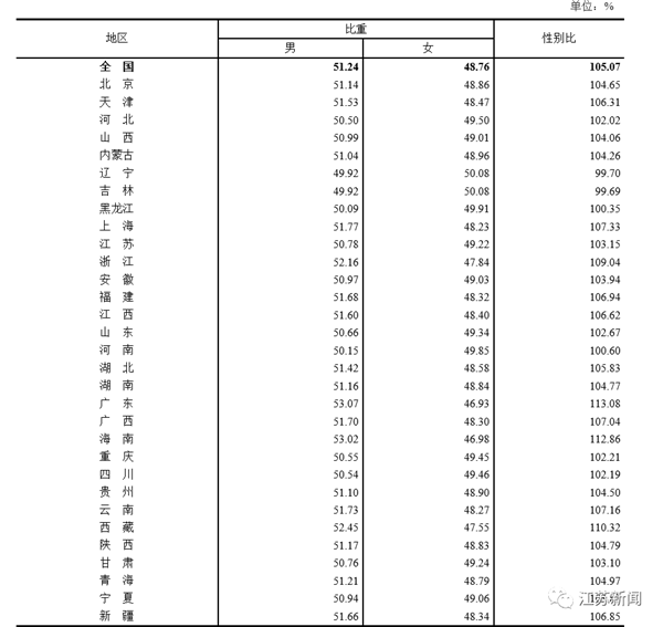 31个省份中,总人口性别比(以女性为100,男性对女性的比例)在100以下的省份有2个,在100至105之间的省份有17个,在105至110之间的省份有9个,在110以上的省份有3个。