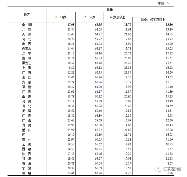 31个省份中,15—59岁人口比重在65%以上的省份有13个,在60%—65%之间的省份有15个,在60%以下的省份有3个。