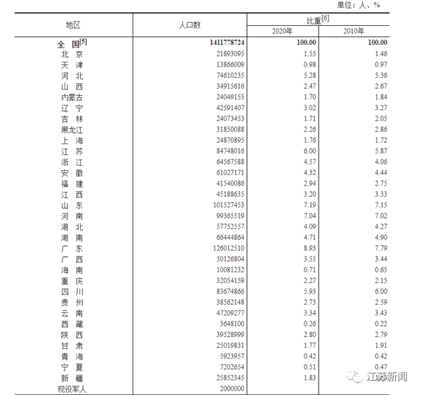 国家统计局局长宁吉喆在会上通报,全国人口共141178万人,与2010年的133972万人相比,增加了7206万人,增长5.38%;年平均增长率为0.53%,比2000年到2010年的年平均增长率0.57%下降0.04个百分点。数据表明,我国人口10年来继续保持低速增长态势。