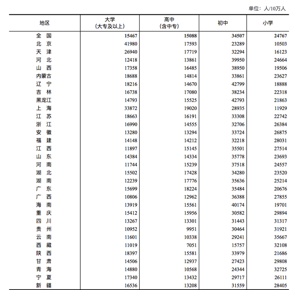 全国具有大学文化程度的人口为21836万人,2010年相比,15岁及以上人口的平均受教育年限由9.08年提高至9.91年,文盲率由4.08%下降为2.67%。