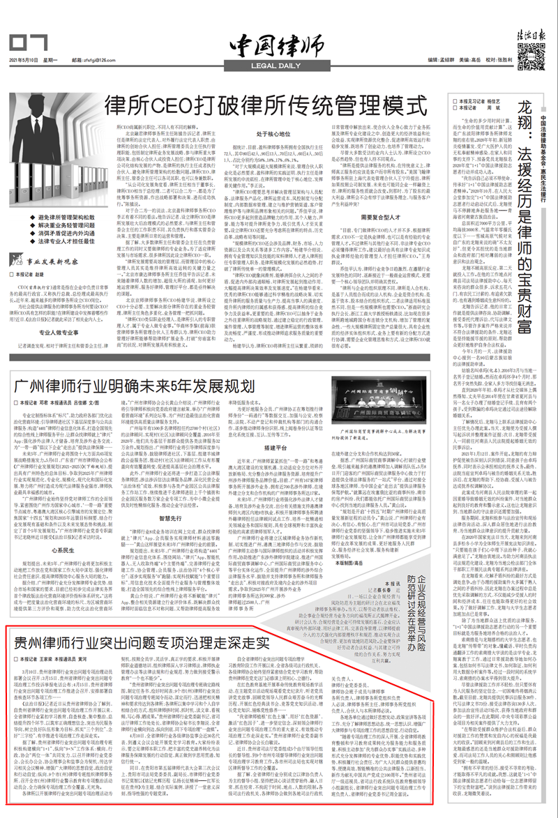 5月10日,《法治日报》中国律师版刊发了《贵州律师行业突出问题专项治理走深走实》的文章。
