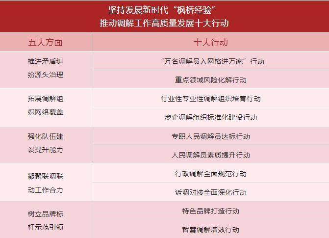 5.以特色品牌打造行动、智慧调解增效行动,不断培育本土调解品牌,推动新时代调解工作向特色化、数字化转型升级。