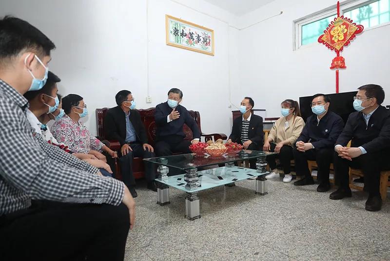 5月14日上午,中共中央总书记、国家主席、中央军委主席习近平在河南省南阳市主持召开推进南水北调后续工程高质量发展座谈会并发表重要讲话。这是座谈会前,习近平于13日在南阳市淅川县九重镇邹庄村,同移民户邹新曾一家三代围坐在一起聊家常。新华社记者 王晔 摄