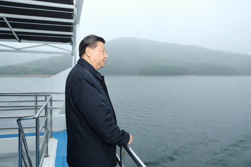 5月14日上午,中共中央总书记、国家主席、中央军委主席习近平在河南省南阳市主持召开推进南水北调后续工程高质量发展座谈会并发表重要讲话。这是座谈会前,习近平于13日在南阳市淅川县乘船考察丹江口水库。新华社记者 鞠鹏 摄