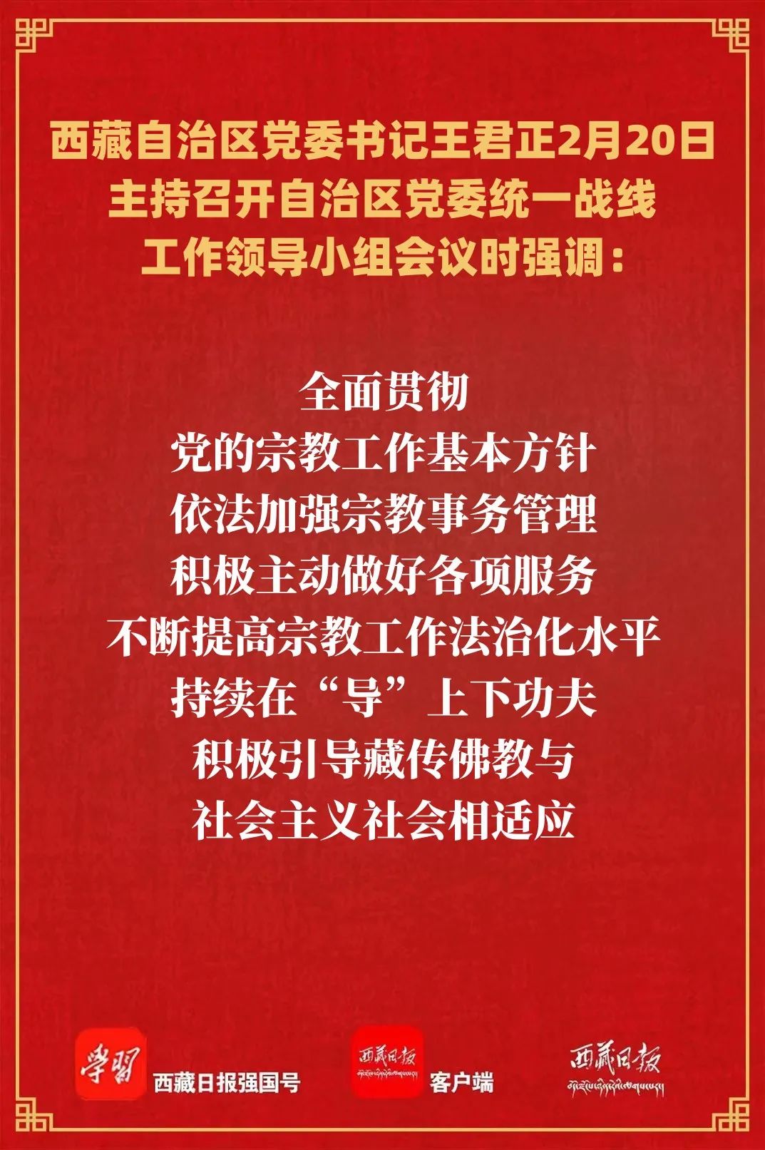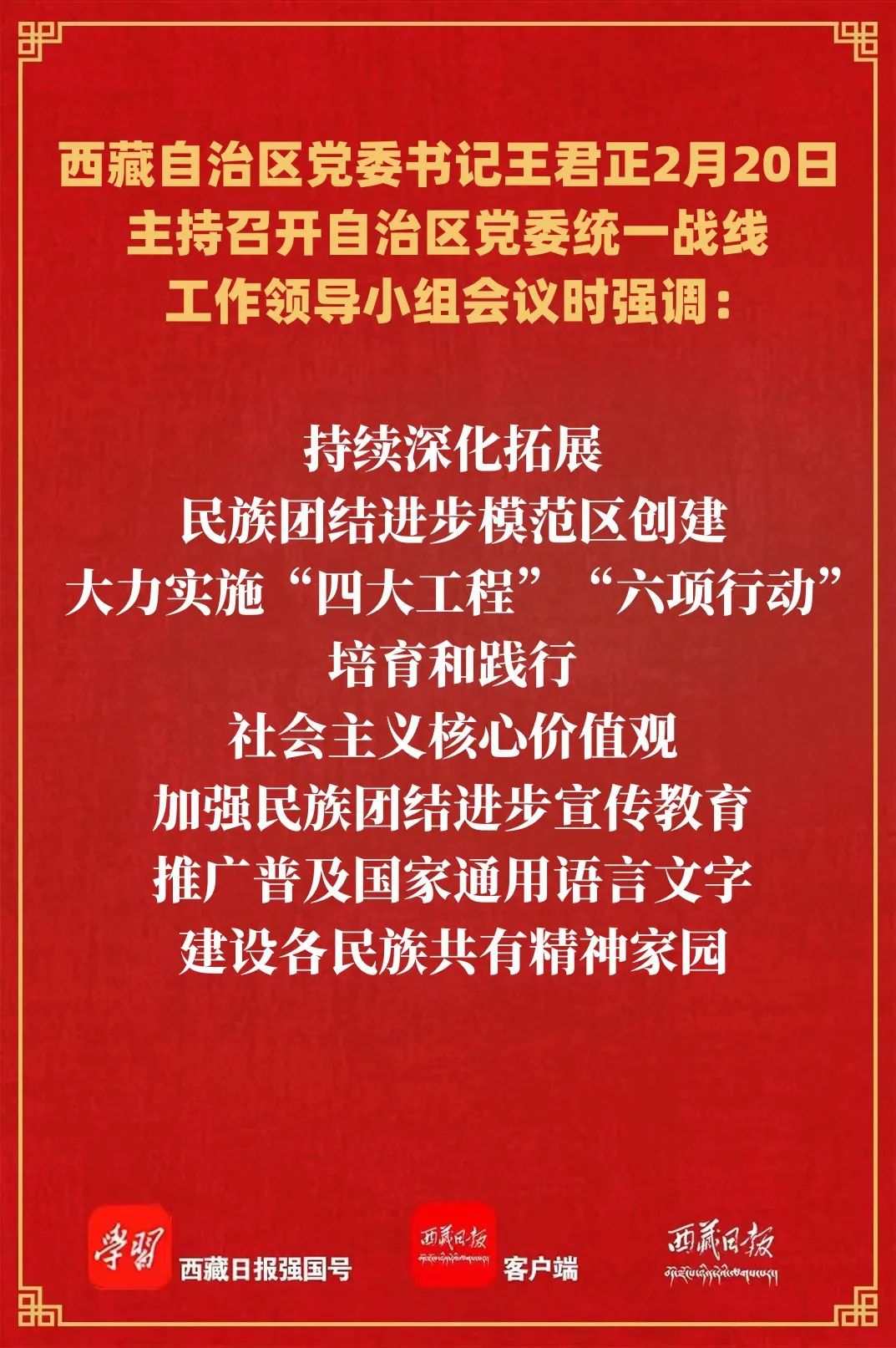 2月20日,自治区党委书记王君正主持召开自治区党委统一战线工作领导小组会议,传达学习中央有关会议精神,听取全区统战工作情况汇报,研究审议有关文件。他强调,要坚持以习近平总书记重要指示统揽西藏统战工作全局,立足实际、突出重点,不断提高全区统战工作水平,努力为长治久安和高质量发展凝聚更多力量、作出更大贡献。