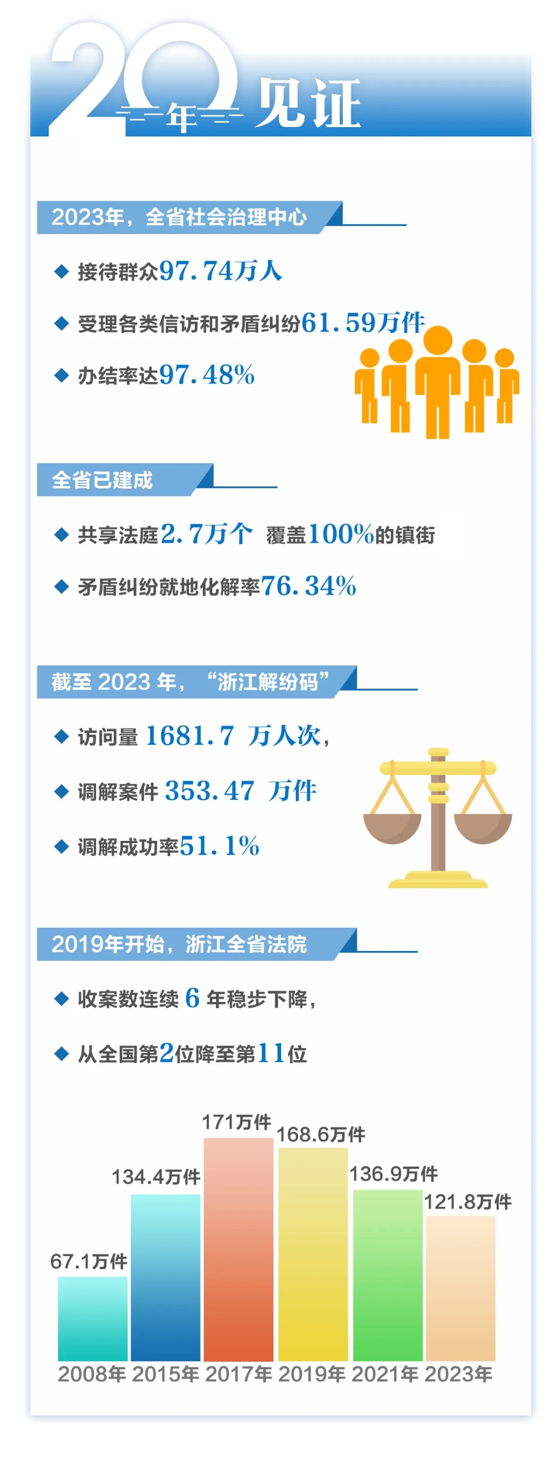 17年来,在创新变革中,浙江走出了一条独具特色的诉源治理之路。长期在立案一线工作,杭州市中级人民法院立案一庭庭长陈辽敏对此体会深切,“现在高效率、低成本的解纷途径越来越多,司法服务触手可及,很多纠纷在‘家门口’就解决了。”